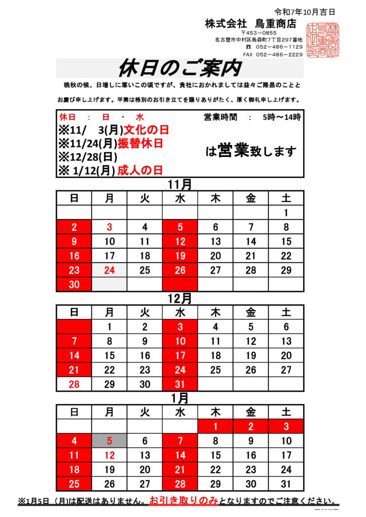 2025年11月・12月・2026年1月の本社工場営業日のご案内です。