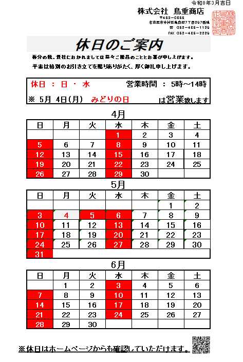 平素は格別のご高配を賜り、厚く御礼申し上げます。 2026年4.5.6月の営業日のお知らせです。 何卒よろしくお願い申し上げます。